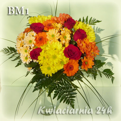 BM5 symbol bukietu Bukiet składa się z żółtych i czerwonych róż, gerber, gerberek mini oraz dodatkowej zieleni dekoracyjnej. Kwiaty można umieścić w koszu wiklinowym. Cena kosza w zależności od ilości kwiatów 30-60zł.