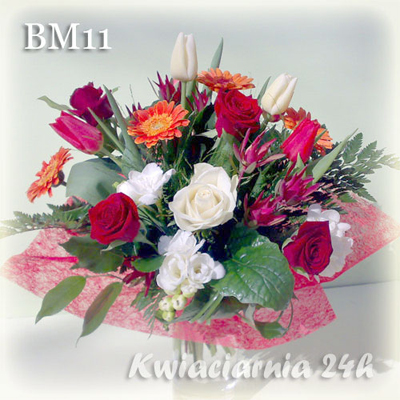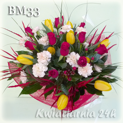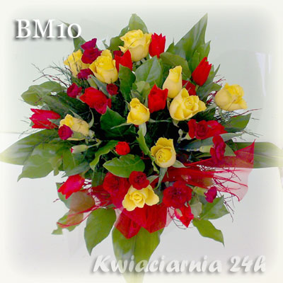 BM10 symbol bukietu Bukiet składa się z gustownej kompozycji róż, tulipanów oraz miniaturowych goździków wraz z eleganckim przybraniem. Wielkość wiązanki uzależniona jest od ilości kwiatów.Całość można umieścić w wiklinowym koszu, którego cena wynosi 30-60zł.