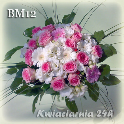 BM12 symbol bukietu Bukiet kwiatów mieszanych w pastelowych barwach. Róże, frezje oraz gerberki mini, komponują się razem doskonale. Kwiaty można umieścić w koszu wiklinowym. Cena kosza w zależności od ilości kwiatów 30-60zł.