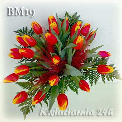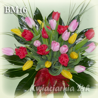BM16 symbol bukietu Bukiet składa się z 25 tulipanów majestatycznie przybranych oraz niosących ze sobą nie tylko przesłanie sympatii i pamięci, ale także ożywczy powiew wiosennego wiatru i pięknego słońca. Kwiaty można umieścić w wiklinowym koszu, którego cena wynosi 30 – 60 zł.