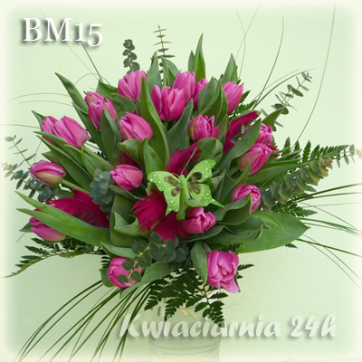 BM15 symbol bukietu Ten bukiet 20 różowych tulipanów może być wyrazem wielu uczuć, które chcesz przekazać wybranej osobie. Kwiaty można umieścić w koszu wiklinowym. Cena kosza w zależności od ilości kwiatów 30-60zł.