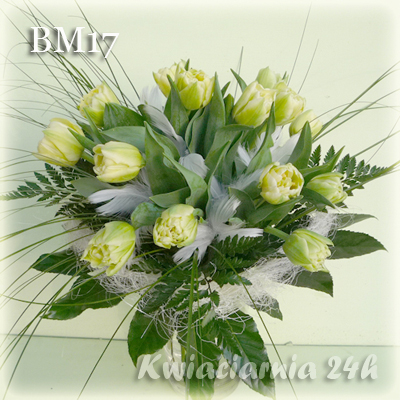BM17 symbol bukietu Bukiet 15 jasnych tulipanów dobrze uświetni ślubne życzenia, a także może być niezobowiązującym przekazem sympatii. Kwiaty można umieścić w koszu wiklinowym. Cena kosza w zależności od ilości kwiatów 30-60zł.