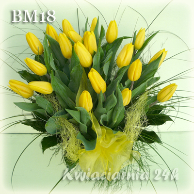 BM18 symbol bukietu Bukiet 20 żółtych tulipanów pełen słońca i radości pomoże rozchmurzyć nie tylko pochmurne niebo, ale i oblicze. Kwiaty można umieścić w koszu wiklinowym. Cena kosza w zależności od ilości kwiatów 30-60zł.