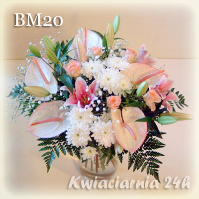 BM20 symbol bukietu Bukiet z kwiatów anturium, róż, koreanek i lilii z dodatkiem białej gipsówki i dekoracyjnej zieleni. Utrzymany w jasnych barwach świetnie dopasuje się do najbardziej wyjątkowych okoliczności. Kwiaty można umieścić w koszu wiklinowym. Cena kosza w zależności od ilości kwiatów 30-60zł.
