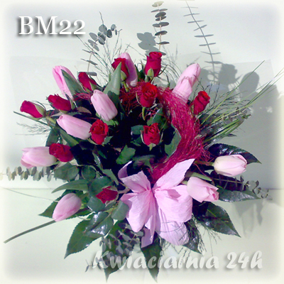 BM22 symbol bukietu Bukiet 11 karminowych róż i 10 jasnoróżowych tulipanów wraz z doskonale dobraną dekoracją uświetni niejedno przyjęcie i nada głębszego wyrazu przekazywanym życzeniom. Kwiaty można umieścić w koszu wiklinowym. Cena kosza w zależności od ilości kwiatów 30-60zł.