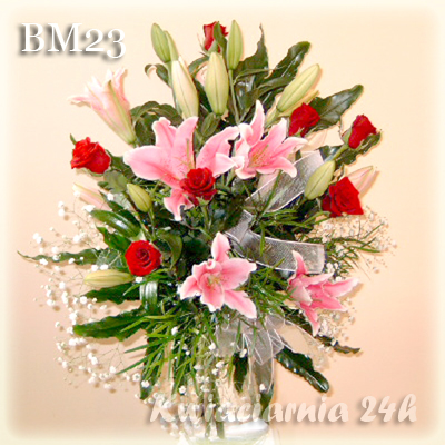 BM23 symbol bukietu Niezwykły koktajlowy bukiet czerwonych róż połączonych z różowymi liliami i białą gipsówką oraz wyrazistą zielenią dekoracji. Kwiaty można umieścić w koszu wiklinowym. Cena kosza w zależności od ilości kwiatów wynosi 30-60zł.