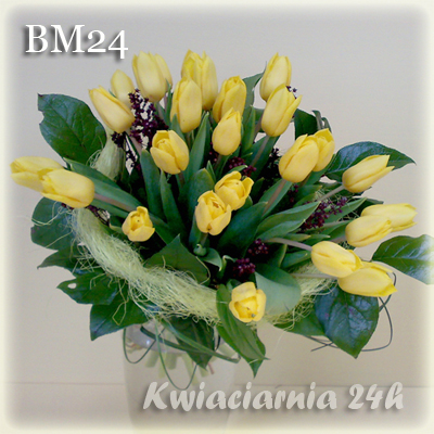 BM24 symbol bukietu Bukiet uroczych żółtych tulipanów pełnych słonecznej radości. Ich ciepła barwa i oryginalna dekoracja nadają mu niezapomnianego uroku. Kwiaty można umieścić w koszu wiklinowym. Cena kosza w zależności od ilości kwiatów 30-60zł.