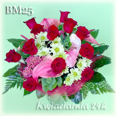 BM25 symbol bukietu Elegancki bukiet złożony z czerwonych róż, białych koreanek i różowych kwiatów anturium z dodatkiem inspirującej dekoracji. Kwiaty można umieścić w koszu wiklinowym. Cena kosza w zależności od ilości kwiatów 30-60zł.