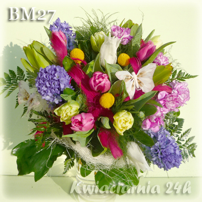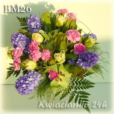 BM27 symbol bukietu Wyjątkowo radosny bukiet wiosennych kwiatów na każdą okazję. Tulipany oraz hiacynty dostępne są tylko sezonowo. Kwiaty można umieścić w koszu wiklinowym. Cena kosza w zależności od ilości kwiatów 30-60zł.