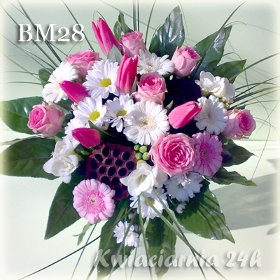 BM28 symbol bukietu Różowo-biały koktajlowy bukiet złożony z róż, tulipanów, gerberów, koreanek i frezji wykończony niezwykłą dekoracją. Kwiaty można umieścić w koszu wiklinowym. Cena kosza w zależności od ilości kwiatów 30-60zł.