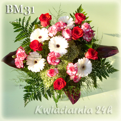 BM31 symbol bukietu Zdominowany przez czerwień bukiet róż, goździków i gerber, tonowany delikatnie bielą pozwoli przekazać zarówno siłę uczuć, jak i radość czy spokój towarzyszące ofiarodawcy. Nadzieja niesiona przez intensywną zieleń dekoracji doskonale dopełnia całość kompozycji.Kwiaty można umieścić w koszu wiklinowym. Cena kosza w zależności od ilości kwiatów wynosi 30-60zł.