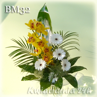 BM32 symbol bukietu Oryginalny i elegancki bukiet powstały z połączenia żółto-czerwonych orchidei i białych gerberów mini. Tak ekskluzywna kompozycja kwiatowa nie może pozostać niedoceniona. Kwiaty można umieścić w koszu wiklinowym. Cena kosza w zależności od ilości kwiatów wynosi 30-60zł.