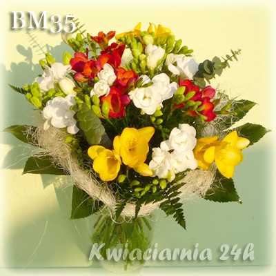 BM35 symbol bukietu Ciepły i kolorowy bukiet frezji z przybraniem. Jego delikatny i subtelny wygląd uświetni niejedną okazję i doda składanym życzeniom więcej serdeczności. Kwiaty można umieścić w koszu wiklinowym. Cena kosza w zależności od ilości kwiatów wynosi 30-60zł.