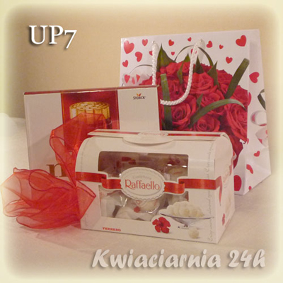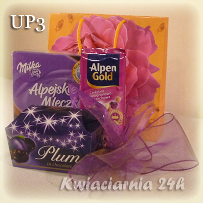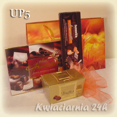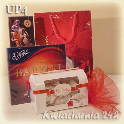 Ten efektowny zestaw słodkości zawiera bombonierki, dwie duże czekolady, pomadki, Ferrero, maskotkę oraz dekoracja. Całość ozdobiona szyfonową wstążką.