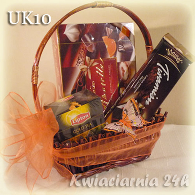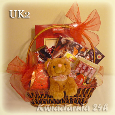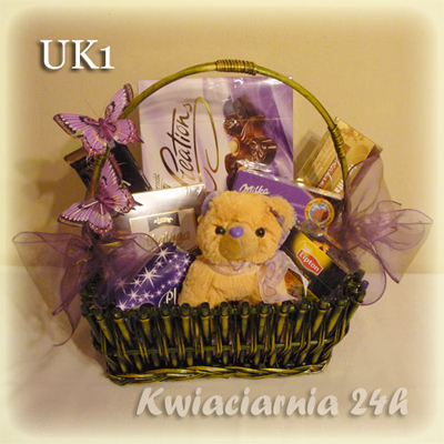 Kosz pełen słodkości z ciekawą dekoracją. W skład upominku wchodzi; bomboniera, duża czekolada, ptasie mleczko, pomadki, herbata, oraz pluszak (ok.20cm wysokości). Wszysko przybrane w efektowny sposób, ozdobione motylkami i szyfonową wstążką.