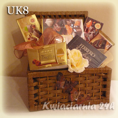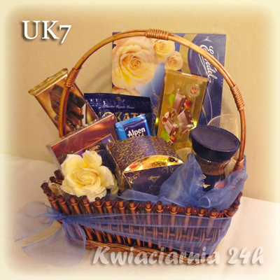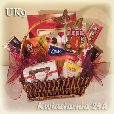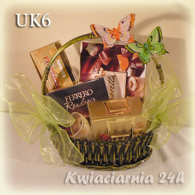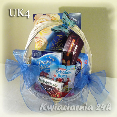 Kosz pełen słodkości z ciekawą dekoracją. W skład upominku wchodzi; bomboniera, duża czekolada, ptasie mleczko, pomadki, herbata, oraz pluszak (ok.20cm wysokości). Wszysko przybrane w efektowny sposób, ozdobione motylkami i szyfonową wstążką.