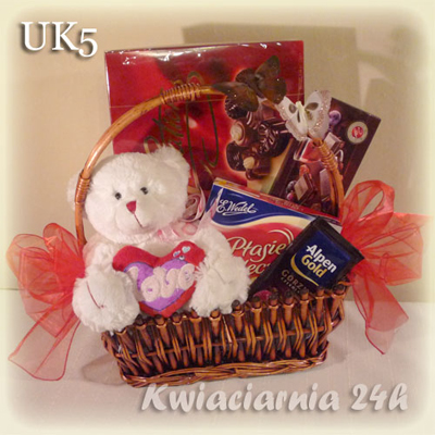 Ten efektowny zestaw słodkości zawiera bombonierki, dwie duże czekolady, pomadki, Ferrero, maskotkę oraz dekoracja. Całość ozdobiona szyfonową wstążką.