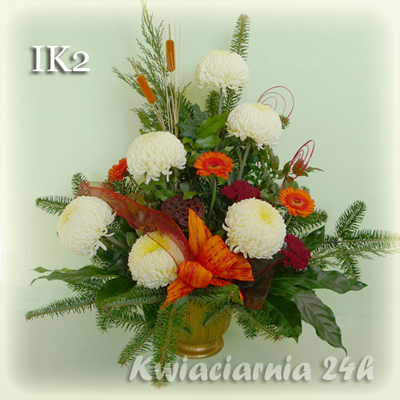 IK2 symbol kompozycji Ikebana ułożona w plastikowym naczyniu. Chryzantemy dostępne są tylko sezonowo, ale można zastąpić je innym rodzajem kwiatów, które będą równie piękne, efektowne i trwałe.