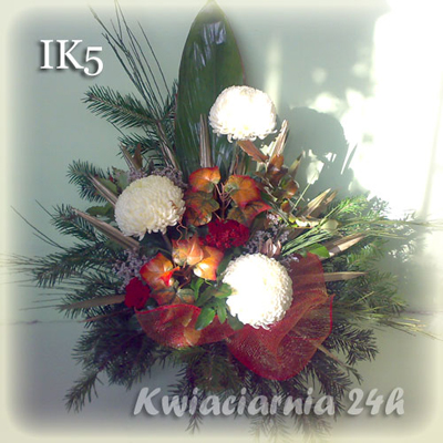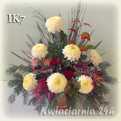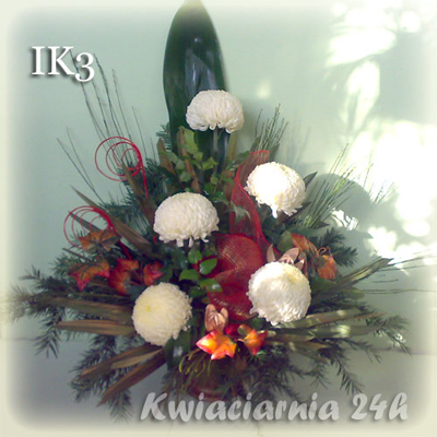 IK7 symbol kompozycji Ikebana ze świeżych chryzantem, umieszczona w plastikowym naczyniu. Chryzantemy dostępne są tylko sezonowo, jednak można je z powodzeniem zastąpić innym rodzajem kwiatów.