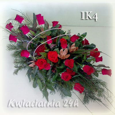 IK4 symbol kompozycji Efektowna ikebana z czerwonych róż, oraz dodatkowej zieleni dekoracyjnej. Kwiaty można umieścić w dowolnym naczyniu lub na florecie. Kształt kompozycji, wielkość oraz ilość kwiatów dowolna.