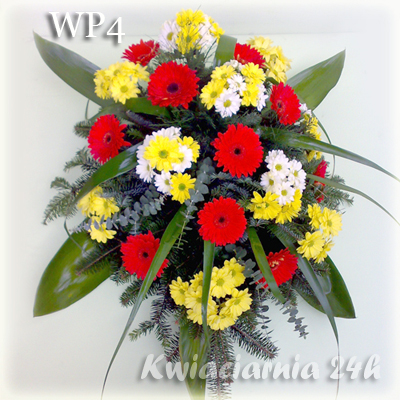 WP4 symbol wiązanki Wiązanka czerwonych gerberów z dodatkiem białych i żółtych koreanek na podkładzie z igliwia, wykończony dekoracyjną zielenią. Kwiaty są trwałe i wielokolorowe. Na życzenie klienta dodajemy szarfę żałobną z dedykacją.