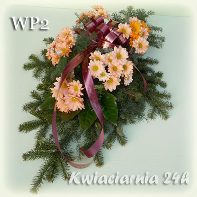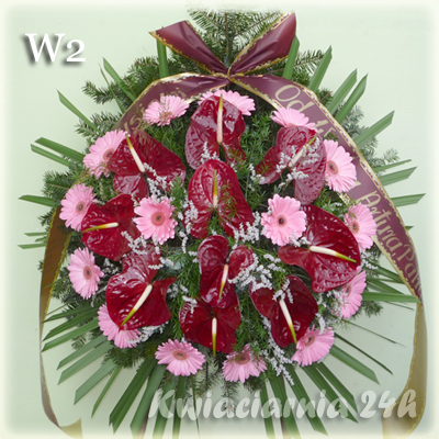 W2 symbol wieńca Wieniec z bordowego anturium wraz z rózowymi gerberami. Kwiaty te na podkładzie jodłowym prezentują się wyjątkowo efektownie. Wykazują się niezwykłą trwałością bez wody, nawet do kilku dni pozostają nienaruszone. Anturium dostępne są w szerokiej gamie kolorów oraz odmian. Ilość kwiatów dowolna.