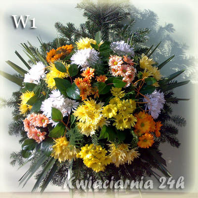 W1 symbol wieńca Wieniec składa się z koreanek w ciepłej kolorystyce. Dzięki dodatkowej zieleni dekoracyjnej, która jest idealnym dopełnieniem, kwiaty prezentują się wyjatkowo efektownie. Koreanki dostępne są w szerokiej gamie kolorów oraz odmian. Ilość kwiatów dowolna.