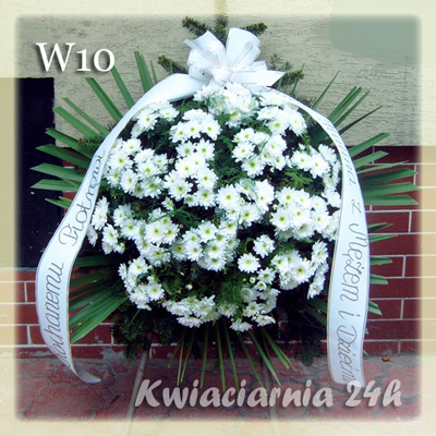 W10 symbol wieńca Wieniec składa się z białej koreanki "Euro" To odmiana o pełnych kwiatach, bardzo trwała. Kwiaty dostępne są także w innych kolorach. Ilość kwiatów dowolna.