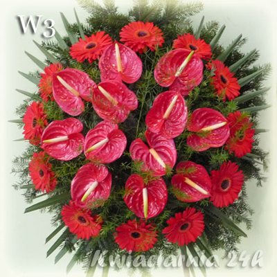 W3 symbol wieńca Wieniec z czerwonego anturium w połączeniu z gerberami. Anturium oraz gerbery dostępne są w szerokiej gamie kolorów oraz odmian. Ilość kwiatów dowolna. Kwiaty te charakteryzują się wyjątkowo dużą trwałością. Bez wody utrzymują się nawet kilka dni w idealnym, nienaruszonym stanie.
