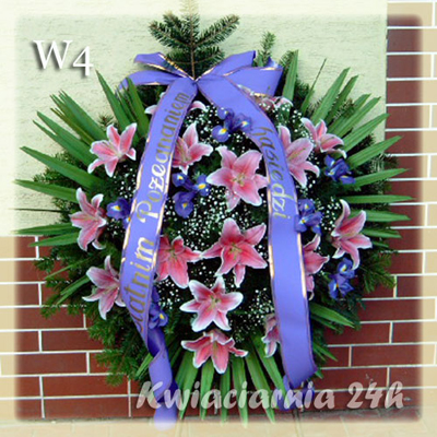 W4 symbol wieńca Różowa lilia z irysami komponują się wyjątkowo ładnie. Dodatkowa zieleń stanowi idealne tło a gipsówka wypełnienie miejsc pomiędzy kwiatami. Ilość kwiatów dowolna. Lilie dostępne sezonowo w wielu kolorach i odmianach.