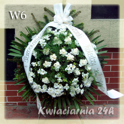 W6 symbol wieńca Piękny, bardzo efektowny wieniec z białych koreanek oraz białych frezji. Kwiaty dostępne są w wielu kolorach. Ilość kwiatów dowolna. Frezje dostępne są sezonowo.
