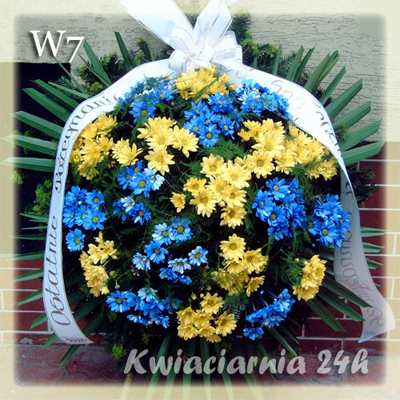 W7 symbol wieńca Wieniec składa się z niebiesko żółtych koreanek. Dzięki dodatkowej zieleni dekoracyjnej, która jest idealnym dopełnieniem, kwiaty prezentują się wyjatkowo efektownie. Koreanki dostępne są w szerokiej gamie kolorów oraz odmian. Ilość kwiatów dowolna.