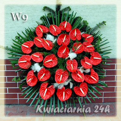 W9 symbol wieńca Piękny, bardzo efektowny wieniec z czerwonych anturium. Kwiaty dostępne są w wielu odcieniach czerwieni aż po bordo, wykazują się ogromną trwałością, nawet w mało sprzyjających warunkach w upalne dni. Ilość kwiatów dowolna.